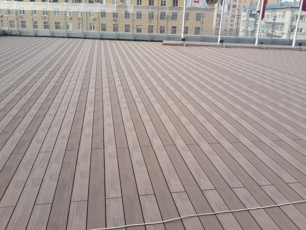Для ее обустройства использовались регулируемые опоры NewMaxi, лаги из ДПК, доска террасная WOOZEN для финишной отделки крыши. Отличительной особенностью террасных досок является возможность укладки ее под разными направлениями для преломления лучей света и создания на эксплуатируемой поверхности стильного, оригинального узора.