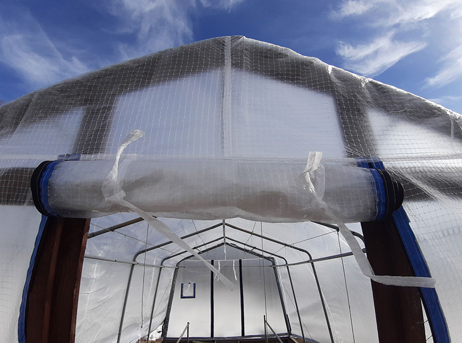 По низу добавлен материал пленки, чтобы чехол доставал до земли. Но все равно мы рекомендуем обустроить низ теплицы фундаментом из бруса или толстой доски, чтобы было к чему крепить и прижимать чехол.